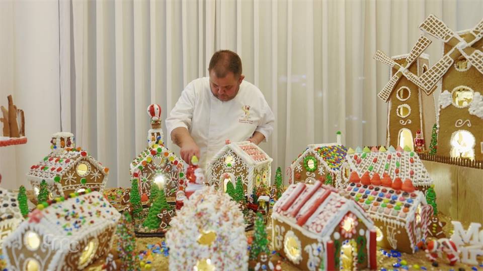 Het dorp bestaat uitsluitend uit suiker, meel, chocolade en snoepgoed. Gedurende 45 dagen was de banketbakker samen met zijn team hier 45 dagen mee bezig en er werd elke dag van ‘s ochtends vroeg tot acht uur ‘s avond aan gewerkt.