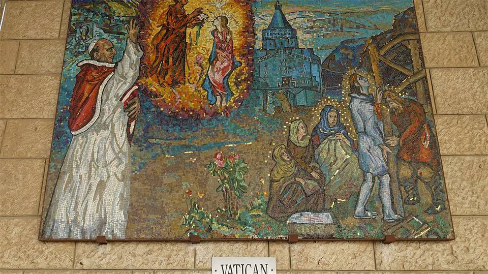 Het glasraam van Maria Hulp der Christenen en Koningin van Slovenië, heeft een plaats gekregen in de portiek rechts voor de Basiliek van de Aankondiging, en bevindt zich daar bij alle andere afbeeldingen van Onze Lieve Vrouw uit de hele wereld.