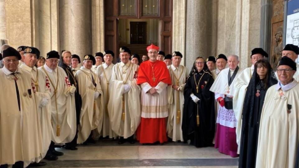 Kardinaal Pierbattista Pizzaballa wordt door de leden van de Orde gefeliciteerd